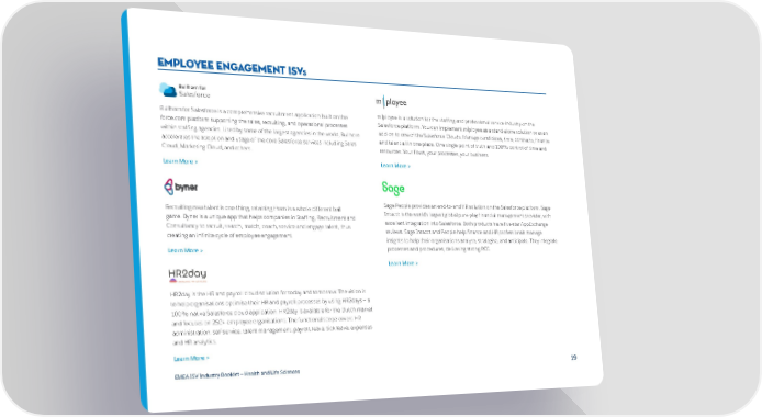 employee engagement ISVS Bullhorn for Salesforce is a comprehensive recruitment application built on the m|ployee is a solution for the staffing and professional service industry on the force.com platform supporting the sales, recruiting, and operational processes Salesforce platform. You can implement m|ployee as a stand-alone solution or as an within staffing agencies. Used by some of the largest agencies in the world, Bullhorn add-on to one of the Salesforce Clouds. Manage candidates, time, contracts, finance accelerates the adoption and usage of the core Salesforce services including Sales and talent all in one place. One single point of truth and 100% control of time and Cloud, Marketing Cloud, and others. resources. Your flows, your processes, your business. Learn More > Learn More > Recruiting new talent is one thing, retaining them is a whole different ball Sage People provides an end-to-end HR solution on the Salesforce platform. Sage game. Byner is a unique app that helps companies in Staffing, Recruitment and Intacct is the world’s largest global pure-play financial management provider, with Consultancy to recruit, search, match, coach, service and engage talent, thus excellent integration into Salesforce. Both products have five-star AppExchange creating an infinite cycle of employee engagement. reviews. Sage Intacct and People help finance and HR professionals manage insights to help their organisations analyse, strategise, and anticipate. They integrate Learn More > processes and procedures, delivering strong ROI. Learn More > HR2day is the HR and payroll cloud solution for today and tomorrow. The vision is to help organisations optimise their HR and payroll processes by using HR2days — a 100% native Salesforce cloud application. HR2day is available for the Dutch market and focuses on 250+ employee organisations. The functional scope covers HR administration, self service, talent management, payroll, leave, sick leave, expenses and HR analytics. Learn More > EMEA ISV Industry Booklet — Health and Life Sciences 19