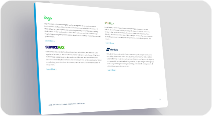 Sage People is a flexible and highly-configurable global cloud solution built on Axtria SalesIQ™ is the only end-to-end sales planning and operations solution the Salesforce platform. Global automation and actionable insights empower HR built for the Life Sciences industry, enabling effective and motivated sales teams while delivering great experiences, supporting new ways of working and enabling to drive higher commercial success. With its comprehensive capabilities, Axtria the business to flow and people to thrive. For healthcare and Life Sciences, Sage SalesIQ™ provides a seamless flow of data to insights to action. The enterprise-grade People helps manage employees across departments and keep track of licenses and technology delivers improved productivity, efficiency, scalability, integration, and qualifications. security. Learn More > Learn More > With ServiceMax, service leaders, dispatchers, technicians, and sales can work With Skedulo’s Australian-built Deskless Productivity Cloud, organizations gain a together effectively to deliver better customer outcomes with the aid of the latest scheduling platform that meets the unique requirements of the NDIS and CDC. mobile tools, access to up-to-date service, entitlement, and asset information, Organizations like HealthStrong, Yooralla, and Baptcare use Skedulo to intelligently best-in-class service process flows, and deep insight into service profitability. Digital manage mobile worker data, including matching the right caregiver to the right job records help you maintain service history and compliance data for every piece of and facility, rostering, scheduling, dispatching, and efficiently routing workers, all equipment. while delivering seamless onsite care. Learn More > Learn More > APAC ISV Industry Booklet — Healthcare & Life Sciences 5
