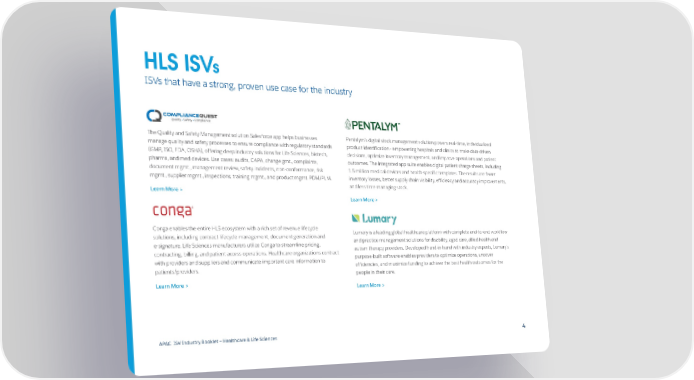 HLS ISVs ISVs that have a strong, proven use case for the industry The Quality and Safety Management solution Salesforce app helps businesses Pentalym’s digital stock management solution powers real-time, individualized manage quality and safety processes to ensure compliance with regulatory standards product identification - empowering hospitals and clinics to make data-driven (GMP, ISO, FDA, OSHA), offering deep industry solutions for Life Sciences, biotech, decisions, optimize inventory management, and improve operations and patient pharma, and med devices. Use cases: audits, CAPA, change gmt., complaints, outcomes. The integrated app suite enables digital patient charge sheets, including document mgmt., management review, safety incidents, non-conformance, risk 1.5 million medical devices and health-specific templates. The results are fewer mgmt., supplier mgmt., inspections, training mgmt., and product mgmt. PDM/PLM. inventory losses, better supply chain visibility, efficiency and accuracy improvements, and less time managing stock. Learn More > Learn More > Conga enables the entire HLS ecosystem with a rich set of revenue lifecycle Lumary is a leading global healthcare platform with complete end-to-end workflow solutions, including contract lifecycle management, document generation and and practice management solutions for disability, aged care, allied health and e-signature. Life Sciences manufacturers utilize Conga to streamline pricing, autism therapy providers. Developed hand-in-hand with industry experts, Lumary’s contracting, billing, and patient access operations. Healthcare organizations contract purpose-built software enables providers to optimize operations, uncover with providers and suppliers and communicate important care information to efficiencies, and maximize funding to achieve the best health outcomes for the patients/providers. people in their care. Learn More > Learn More > APAC ISV Industry Booklet — Healthcare & Life Sciences 4