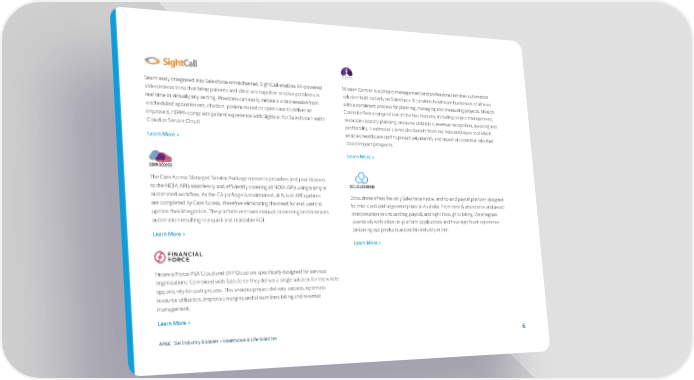 Seamlessly integrated into Salesforce omnichannel, SightCall enables AR-powered Mission Control is a project management and professional services automation video interactions that bring patients and clinicians together to solve problems in solution built natively on Salesforce. It provides healthcare businesses of all sizes real time in virtually any setting. Providers can easily initiate a video session from with a consistent process for planning, managing and measuring projects. Mission a scheduled appointment, chatbot, patient record or open case to deliver an Control offers a range of out-of-the-box features, including project management, improved, HIPPA-compliant patient experience with Sightcall for Salesforce Health resource capacity planning, resource utilization, revenue recognition, invoicing and Cloud or Service Cloud. profitability. Healthcare clients also benefit from the risks and issues tool which enables healthcare staff to proactively identify and report on potential risks that Learn More > could impact prospects. Learn More > The Care Access Managed Service Package connects providers and practitioners to the NDIA APIs seamlessly and efficiently covering all NDIA APIs using a simple automated workflow. As the CA package is maintained, all future API updates 2cloudnine offers the only Salesforce native, end-to-end payroll platform designed are completed by Care Access, therefore eliminating the need for end users to for mid-sized and large enterprises in Australia. From time & attendance and award update their integration. The platform removes manual processing and increases interpretation to onboarding, payroll, and right through to billing. We integrate automation resulting in a quick and realizable ROI. seamlessly with other on-platform applications and have significant experience Learn More > delivering our products across this industry sector. Learn More > FinancialForce PSA Cloud and ERP Cloud are specifically designed for services organizations. Combined with Salesforce they deliver a single solution for the whole opportunity-to-cash process. This ensures project delivery success, optimizes resource utilization, improves margins and streamlines billing and revenue management. Learn More > APAC ISV Industry Booklet — Healthcare & Life Sciences 6