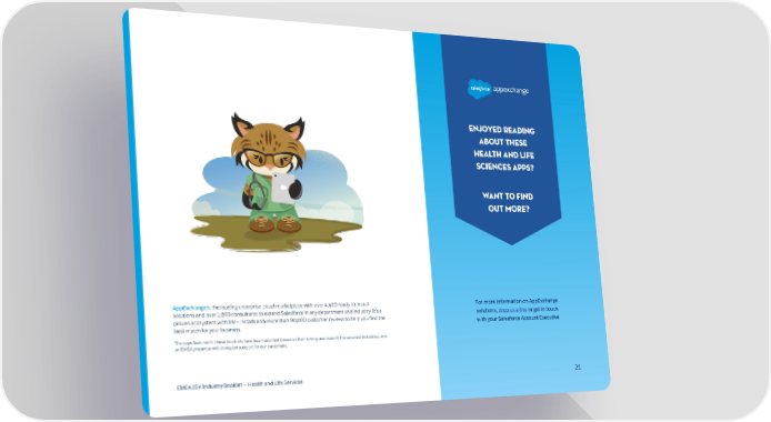 Enjoyed reading about these Health and Life Sciences apps? Want to find out more? AppExchange is the leading enterprise cloud marketplace with over 4,400 ready-to-install For more information on AppExchange solutions and over 1,800 consultants to extend Salesforce in any department and industry. It’s a solutions, drop us a line or get in touch proven ecosystem with 8M+ installs and more than 90,000 customer reviews to help you find the with your Salesforce Account Executive best match for your business. The apps featured in these booklets have been selected based on their strong use cases in the selected industries, and an EMEA presence with in-region support for our customers. EMEA ISV Industry Booklet – Health and Life Services 212121