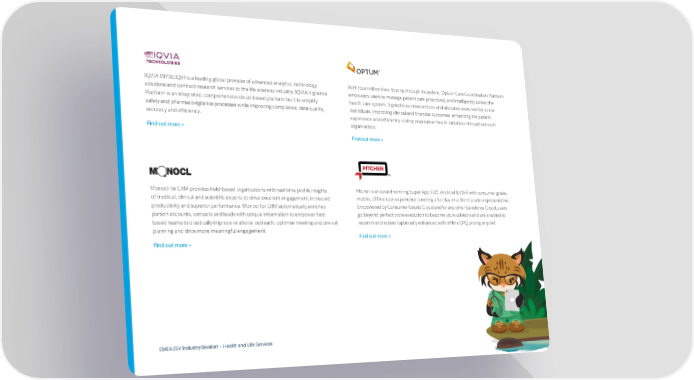 IQVIA (NYSE:IQV) is a leading global provider of advanced analytics, technology With four million lives flowing through its system, Optum Care Coordination Platform solutions and contract research services to the life sciences industry. IQVIA Vigilance empowers users to manage patient care proactively and intelligently across the Platform is an integrated, comprehensive cloud-based platform built to simplify health care system. It prioritises interventions and allocates resources for at-risk safety and pharmacovigilance processes while improving compliance, data quality, individuals, improving clinical and financial outcomes, enhancing the patient accuracy and efficiency. experience and efficiently scaling population health initiatives throughout each organisation. Find out more > Find out more > Monocl for CRM provides field-based organisations with real-time profile insights Pitcher is an award-winning Super App (iOS, Android & Win) with consumer grade, of medical, clinical and scientific experts to drive excellent engagement, increased mobile, offline user experience covering a full day-in-a-life of a sales representative. productivity and superior performance. Monocl for CRM automatically enriches Empowered by Consumer Goods Cloud and/or any other Salesforce Cloud, users person accounts, contacts and leads with unique information to empower field- go beyond perfect store execution to become store advisors and are enabled to based teams to drastically improve relational outreach, optimise meeting and pre-call recommend orders (optionally enhanced with offline CPQ pricing engine). planning and drive more meaningful engagement. Find out more > Find out more > EMEA ISV Industry Booklet – Health and Life Services