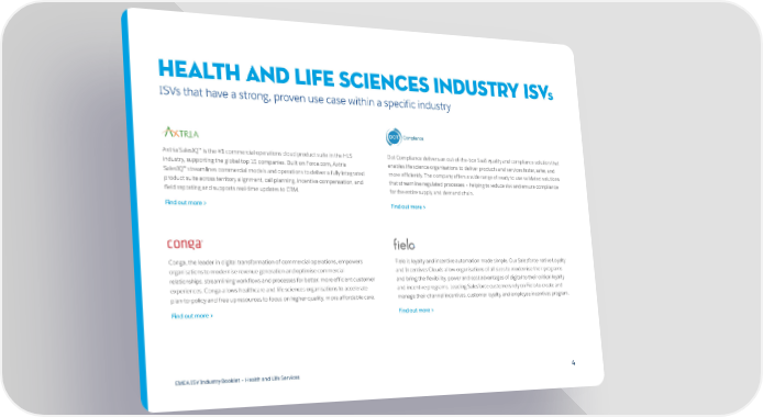 Health and Life Sciences Industry ISVs ISVs that have a strong, proven use case within a specific industry DOT. Compliance Axtria SalesIQ™ is the #1 commercial operations cloud product suite in the HLS Dot Compliance delivers an out-of-the-box SaaS quality and compliance solution that industry, supporting the global top 15 companies. Built on Force.com, Axtria enables life science organisations to deliver products and services faster, safer, and SalesIQ™ streamlines commercial models and operations to deliver a fully integrated more efficiently. The company offers a wide range of ready to use validated solutions product suite across territory alignment, call planning, incentive compensation, and that streamline regulated processes – helping to reduce risk and ensure compliance field reporting and supports real-time updates to CRM. for the entire supply and demand chain. Find out more > Find out more > Conga, the leader in digital transformation of commercial operations, empowers Fielo is loyalty and incentive automation made simple. Our Salesforce-native Loyalty organisations to modernise revenue generation and optimise commercial and Incentives Clouds allow organisations of all sizes to modernise their programs relationships, streamlining workflows and processes for better, more efficient customer and bring the flexibility, power and cost advantages of digital to their critical loyalty experiences. Conga allows healthcare and life sciences organisations to accelerate and incentive programs. Leading Salesforce customers rely on Fielo to create and plan-to-policy and free up resources to focus on higher-quality, more affordable care. manage their channel incentives, customer loyalty, and employee incentives program. Find out more > Find out more > EMEA ISV Industry Booklet – Health and Life Services 44