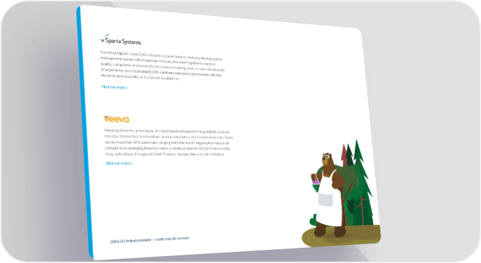 TrackWise Digital® cloud QMS software is Sparta Systems’ industry-leading quality management system with integrated modules that work together to support quality, compliance and more efficient decision-making. Built on over two decades of experience, our cloud-based QMS combines best practice processes with the flexibility and scalability of the Salesforce platform. Find out more > Veeva Systems Inc. is the leader in cloud-based software for the global life sciences industry. Committed to innovation, product excellence, and customer success, Veeva serves more than 875 customers, ranging from the world’s largest pharmaceutical companies to emerging biotechs. Veeva is headquartered in the San Francisco Bay Area, with offices throughout North America, Europe, Asia, and Latin America. Find out more > EMEA ISV Industry Booklet – Health and Life Services