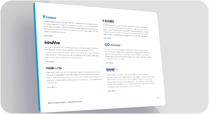 Fonteva enables membership organisations to modernise their technology platform Unleash the power of content without leaving Salesforce. Seismic’s leading sales to navigate today’s fast-changing environment, better serve members, and achieve enablement solution delivers personalised content at scale right from the Salesforce current and future goals. Fonteva is a full enterprise software solution used by over platform. Over 700 enterprises, including IBM, Allianz, and American Express, rely 300 associations around the world to bring member communities together and drive on Seismic’s solution to support field and inside sales teams, helping to improve data-informed decision making. sales efficiency, increase Salesforce engagement, and close bigger deals faster. Learn More > Learn More > Recently recognised as a top 10 fastest growing technology company in Deloitte’s Showpad is the most complete and flexible sales enablement platform, relied Fast 50 Awards, Introhive helps organisations realise the full value of their on by marketing and sales teams to prepare sellers, engage buyers and optimise relationships and under-utilised data. By ensuring adoption at all levels of Salesforce performance through insights. Providing a single user experience, our solution implementation, Introhive ensures users fully embrace CRM and keeps data clean makes it easy to discover and share the right content, deliver training and coaching, and accurate, thus increasing ROI and pipeline growth. and maximise seller productivity. Learn More > Learn More > Make mobile calls count, with the only operator-agnostic, network-grade solution that provides organisations with a 360-degree view of business communications SmartCOMM™ for Salesforce is the industry-leading enterprise document without compromising on privacy. Capture, log, record, transcribe and integrate your generation platform specifically designed to meet today’s complex customer needs. employees’ cellular business communications with Salesforce, HVS, AI-based BI and SmartCOMM helps enterprises deliver personalised, interactive communications other systems. via customers’ preferred channels. Designed for the business user, SmartCOMM Learn More > simplifies and standardises communications processes leading to improved internal efficiency, increased ROI and better customer experience. Learn More > EMEA ISV Industry Booklet — Health and Life Sciences 9