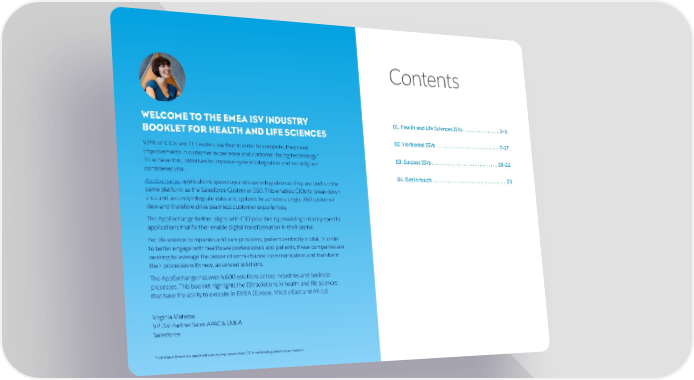 Contents WELCOME TO THE EMEA ISV INDUSTRY 01. Health and Life Sciences ISVs . . . . . . . . . . . . . . . . 3–6 BOOKLET FOR HEALTH AND LIFE SCIENCES 02. Horizontal ISVs . . . . . . . . . . . . . . . . . . . . . . . . . . . .7–17 93% of CIOs and IT Leaders say that in order to compete, they need improvements in customer experience and customer facing technology.* 03. Success ISVs . . . . . . . . . . . . . . . . . . . . . . . . . . . . . 18–22 To achieve this, initiatives to improve system integration and security are considered vital. 04. Get in touch . . . . . . . . . . . . . . . . . . . . . . . . . . . . . . . . 23 AppExchange applications speed up and ease integration as they are built on the same platform as the Salesforce Customer 360. This enables CIOs to break down silos and securely integrate data and systems to achieve a single 360 customer view and therefore drive seamless customer experiences. The AppExchange further aligns with CIO priorities by providing industry-specific applications that further enable digital transformation in their sector. For life science companies and care providers, patient centricity is vital. In order to better engage with healthcare professionals and patients, these companies are working to leverage the power of omni-channel communication and transform their processes with new, advanced solutions. The AppExchange has over 4,600 solutions across industries and business processes. This booklet highlights the ISV solutions in health and life sciences that have the ability to execute in EMEA (Europe, Middle East and Africa). Virginia Matassa VP ISV Partner Sales APAC & EMEA Salesforce **SSaalleessffoorrcce Re Reesseeaarrcch ah annaallyysseed sd suurrvveey ry reessppoonnssees fs frroom 1m 10000+ t+ teecchhnnoollooggy ly leeaaddeerrs ws woorrllddwwiiddee