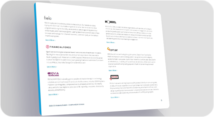 Fielo is loyalty and incentive automation made simple. Our Salesforce-native Monocl for CRM provides field-based organisations with real-time profile insights loyalty and incentives clouds allow organisations of all sizes to modernise their of medical, clinical and scientific experts to drive excellent engagement, increased programs and bring the flexibility, power and cost advantages of digital to their productivity and superior performance. Monocl for CRM automatically enriches critical loyalty and incentive programs. Leading Salesforce customers rely on Fielo person accounts, contacts and leads with unique information to empower field- to create and manage their channel incentives, customer loyalty, and employee based teams to drastically improve relational outreach, optimise meeting and pre- incentive programs. call planning and drive more meaningful engagement. Learn More > Learn More > Significant technological advances have driven a new era of healthcare innovation. With four million lives flowing through its system, Optum Care Coordination Tapping into new opportunities requires business applications that can enable Platform empowers users to manage patient care proactively and intelligently flexibility and growth. FinancialForce ERP Cloud and Professional Services Cloud are across the health care system. It prioritises interventions and allocates resources for built on the Salesforce platform to power growing healthcare businesses. Customers at-risk individuals, improving clinical and financial outcomes, enhancing the patient include Philips, Imprivata, George Clinical and Novotech. experience and efficiently scaling population health initiatives throughout each Learn More > organisation. Learn More > IQVIA (NYSE:IQV) is a leading global provider of advanced analytics, technology solutions and contract research services to the life sciences industry. IQVIA Vigilance Platform is an integrated, comprehensive cloud-based platform built to simplify Pitcher is an award-winning Super App (iOS, Android & Win) with consumer grade, safety and pharmacovigilance processes while improving compliance, data quality, mobile, offline user experience covering a full day-in-a-life of a sales representative. accuracy and efficiency. Empowered by Consumer Goods Cloud and/or any other Salesforce Cloud, users can go beyond perfect store execution to become store advisors and are enabled to Learn More > recommend orders (optionally enhanced with offline CPQ pricing engine). Learn More > EMEA ISV Industry Booklet — Health and Life Sciences 5