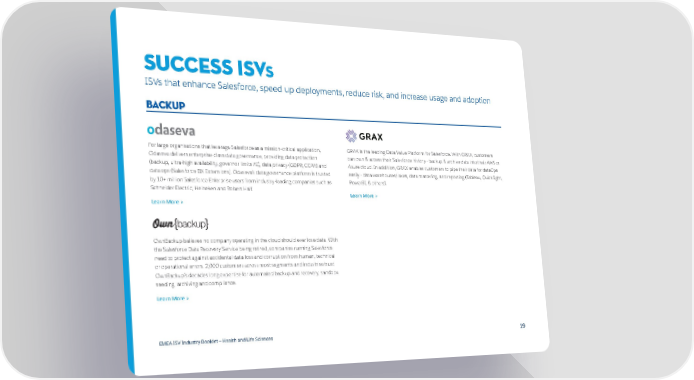 success ISVs ISVs that enhance Salesforce, speed up deployments, reduce risk, and increase usage and adoption backup For large organisations that leverage Salesforce as a mission-critical application, GRAX is the leading Data Value Platform for Salesforce. With GRAX, customers Odaseva delivers enterprise-class data governance, providing data protection can own & access their Salesforce history - backup & archive data into their AWS or (backup, ultra-high availability, governor limits AI), data privacy (GDPR, CCPA) and Azure cloud. In addition, GRAX enables customers to pipe their data for dataOps data ops (Salesforce DX Extensions). Odaseva’s data governance platform is trusted easily - data warehouses/lakes, data mastering, and reporting (Tableau, QuickSight, by 10+ million Salesforce Enterprise users from industry-leading companies such as PowerBI, & others). Schneider Electric, Heineken and Robert Half. Learn More > Learn More > OwnBackup believes no company operating in the cloud should ever lose data. With the Salesforce Data Recovery Service being retired, companies running Salesforce need to protect against accidental data loss and corruption from human, technical or operational errors. 2,000 customers across most segments and industries trust OwnBackup’s decades long expertise for automated backup and recovery, sandbox seeding, archiving and compliance. Learn More > EMEA ISV Industry Booklet — Health and Life Sciences 1919