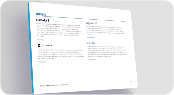 service Built entirely on the Salesforce platform, Cadalys Service Management is a 100% Cognism enables customers to generate new prospect data and update existing native IT Service Management (ITSM) application that delivers out-of-the-box IT records natively within Salesforce. Our customers love how Cognism saves Infrastructure Library (ITIL) workflows, providing a unified service and support them time building new audiences and how we keep bounce rates low, improve experience for employees, customers and partners. Cadalys Service Management segmentation of leads and improve the accuracy of reports by instilling trust in the works seamlessly with Salesforce Service Cloud for fast configuration, ease-of-use, CRM data. and flexibility without the expense and burden of relying on other platforms or software. Learn More > Learn More > Coveo enables enterprises to thrive in the experience age, through delivering unique experiences that are relevant, unified, and valuable. The Coveo Experience Every company runs projects, for research and development marketing, customer Intelligence Platform uses AI, intelligent search and recommendation technologies onboarding, customer success, IT and much more. Cloud Coach is the only to personalise millions of digital experiences. Coveo delivers solutions for commerce enterprise class project management solution built on Salesforce. Cloud Coach and service built on the coveo experience intelligence platform for enterprises in supports both waterfall and agile project methodologies so there is no business we high tech, manufacturing and financial services. can’t help provide value to! Learn More > Learn More > EMEA ISV Industry Booklet — Health and Life Sciences 11