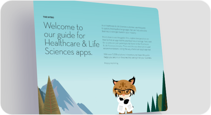 THE INTRO As a Healthcare & Life Sciences customer, use this guide Welcome to to quickly find AppExchange apps that can help you solve business challenges found in your industry. our guide for Here’s how to use the guide: First, explore best practices on how to find an app that fits your business challenge. Next, look for a particular pain point typically found in the Healthcare Healthcare & Life & Life Sciences industry. Then read the app descriptions and recommendations. Along the way, check out Appy’s app tips. Sciences apps. With over 5,000 solutions in inventory, we hope this guide helps you zero in on the ones that are right for your business. Happy exploring.