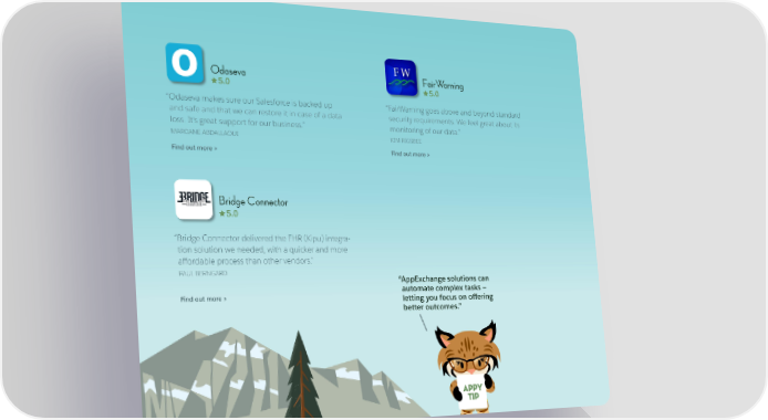 Odaseva FairWarning 5.0 5.0 “ Odaseva makes sure our Salesforce is backed up “ FairWarning goes above and beyond standard and safe and that we can restore it in case of a data security requirements. We feel great about its loss. It's great support for our business.” monitoring of our data.” MAROANE ABDALLAOUI KIM RIGSBEE Find out more > Find out more > Bridge Connector 5.0 “ Bridge Connector delivered the EHR (Kipu) integra- tion solution we needed, with a quicker and more affordable process than other vendors.” PAUL BERNGARD “ AppExchange solutions can automate complex tasks — Find out more > letting you focus on offering better outcomes.” APPY TIP