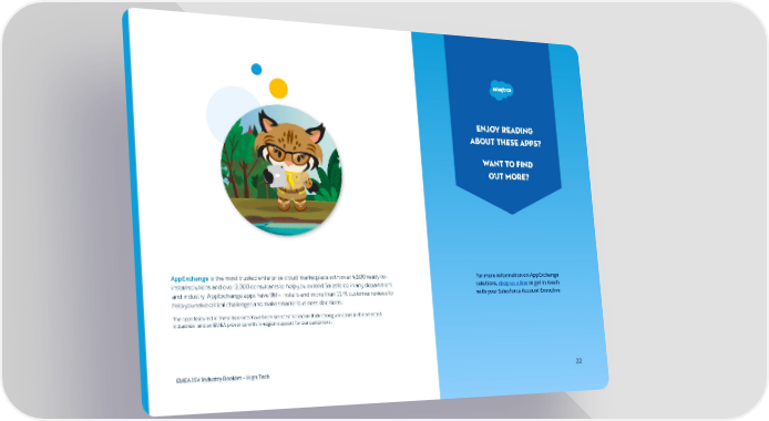 Enjoy reading about these apps? Want to find out more? AppExchange is the most trusted enterprise cloud marketplace with over 4,600 ready-to- For more information on AppExchange install solutions and over 2,000 consultants to help you extend Salesforce in any department solutions, drop us a line or get in touch and industry. AppExchange apps have 9M+ installs and more than 117K customer reviews to with your Salesforce Account Executive help you solve critical challenges and make smarter business decisions. The apps featured in these booklets have been selected based on their strong use cases in the selected industries, and an EMEA presence with in-region support for our customers. EMEA ISV Industry Booklet — High Tech 22