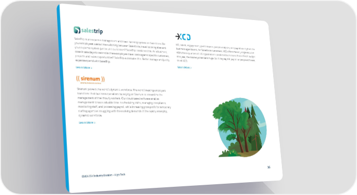 SalesTrip is an expense management and travel booking system on Salesforce. Do HR, talent, engagement, performance, people analytics, and payroll are high on the your employees waste time switching between Salesforce, travel booking sites and business agenda and, for Salesforce customers, XCD offers the only single solution. your expense system just to visit customers? SalesTrip combines this. As a business, With three-quarters of UK organisations predicted to increase their HR tech budget does it take days to reconcile these employee travel costs against specific customers, this year, the market potential is huge. So if they say HR, payroll or people software, projects and sales opportunities? SalesTrip automates this. Better manage and justify think XCD. expense spend with SalesTrip. Learn More > Learn More > Sirenum powers the world’s dynamic workforce. The world’s leading employers transform their business operations by relying on Sirenum to streamline the management of their hourly workers. Our cloud-based software enables management to save valuable time in scheduling shifts, managing compliance, monitoring staff, and processing payroll, while increasing gross profit for temporary staffing agencies struggling with the evolving demands of the rapidly emerging dynamic workforce. Learn More > EMEA ISV Industry Booklet — High Tech 16
