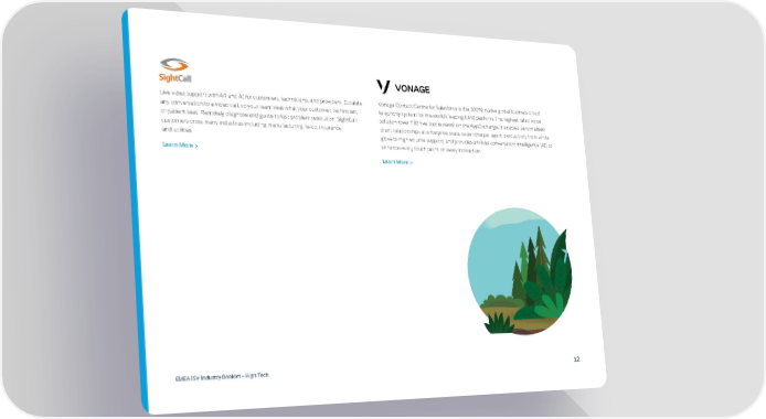 Live video support with AR and AI for customers, technicians, and providers. Escalate Vonage Contact Centre for Salesforce is the 100% native global business cloud any conversation to a video call, so your team sees what your customer, technician, telephony system for the world’s leading CRM platform. The highest rated voice or patient sees. Remotely diagnose and guide to fast problem resolution. SightCall solution (over 730 five-star reviews) on the AppExchange, it enables personalised customers cross many industries including manufacturing, telco, insurance client relationships at enterprise scale, super-charges agent productivity from white and utilities. glove to high volume support, and provides artificial conversation intelligence (AI) to enhance every touch point on every interaction. Learn More > Learn More > EMEA ISV Industry Booklet — High Tech 12
