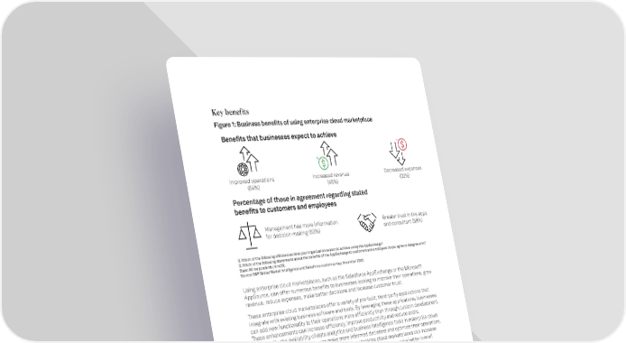 How Customers Use Enterprise Cloud Marketplaces To Respond to New Business Conditions | 3 spglobal.com Key benefits Figure 1: Business benefits of using enterprise cloud marketplace Q. Which of the following efficiencies does your organization expect to achieve using the AppExchange? Q. Which of the following statements about the benefits of the AppExchange to customers and employees do you agree or disagree with? Base: All respondents (n=400). Source: S&P Global Market Intelligence and Salesforce custom survey, November 2022. Using enterprise cloud marketplaces, such as the Salesforce AppExchange or the Microsoft AppSource, can offer numerous benefits to businesses looking to improve their operations, grow revenue, reduce expenses, make better decisions and increase customer trust. These enterprise cloud marketplaces offer a variety of pre-built, third-party applications that integrate with existing business software and tools. By leveraging these applications, businesses can add new functionality to their operations more efficiently than through custom development. These enhancements can increase efficiency, improve productivity and reduce costs. Additionally, the availability of data analytics and business intelligence tools in enterprise cloud marketplaces can help businesses make more informed decisions and optimize their operations. Further, the availability of trusted applications in enterprise cloud marketplaces can increase trust and improve customer satisfaction, leading to increased revenue and a better overall customer experience. Improved operations (54%) Increased revenue (48%) Decreased expenses (32%) + – Benefits that businesses expect to achieve Management has more information for decision-making (63%) Greater trust in the apps and consultant (58%) Percentage of those in agreement regarding stated benefits to customers and employees