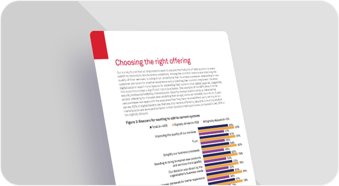 How Customers Use Enterprise Cloud Marketplaces To Respond to New Business Conditions | 4 spglobal.com Choosing the right offering Our survey found that all respondents want to expand the footprint of their systems to some extent to respond to new business conditions. Among the common reasons are improving the quality of their services, building trust, simplifying their business processes, responding to new customer demands for a better experience and protecting their current investment. However, digital leaders report more reasons for expanding their systems than digital laggards, suggesting that experience plays a significant role in purchases. One example of the difference is in the security reviews provided by marketplaces. Security reviews build trust by authenticating access, checking for malware and validating that an app works as intended. As a result, buyers can purchase new apps with the assurance that they have received third-party vetting. In our survey, 68% of digital leaders say that security reviews offered by app and consulting solution marketplaces are an essential factor in their decision-making process, compared to only 35% of the digitally delayed. Figure 2: Reasons for wanting to add to current systems Q. On a scale of 1 to 10, how important are the reasons that you decided to use the AppExchange? Where 0 = not important and 10 = crucially important. Base: All respondents. Source: S&P Global Market Intelligence and Salesforce custom survey, November 2022. 69% 67% 64% 63% 63% 63% 61% 61% 58% 57% 82% 81% 80% 78% 76% 81% 78% 79% 78% 75% 57% 55% 49% 50% 52% 50% 49% 44% 43% 46% Improving the quality of our services Trust Simplify our business processes Needing to bring to market new products and services more quickly Our decision was driven by the organization’s business needs Respond to new customer demands for better experience Extend our current app investment We have standardized on Salesforce and want to extend it into new areas Time to market Respond quickly to an emergency Total (n=400) Digitally driven (n=102) Digitally delayed (n=151)