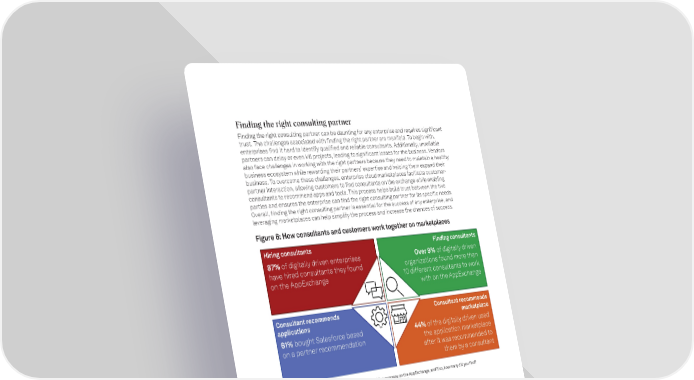 How Customers Use Enterprise Cloud Marketplaces To Respond to New Business Conditions | 8 spglobal.com Finding the right consulting partner Finding the right consulting partner can be daunting for any enterprise and requires significant trust. The challenges associated with finding the right partner are manifold. To begin with, enterprises find it hard to identify qualified and reliable consultants. Additionally, unreliable partners can delay or even kill projects, leading to significant losses for the business. Vendors also face challenges in working with the right partners because they need to maintain a healthy business ecosystem while rewarding their partners’ expertise and helping them expand their business. To overcome these challenges, enterprise cloud marketplaces facilitate customer- partner interaction, allowing customers to find consultants on the exchange while enabling consultants to recommend apps and tools. This process helps build trust between the two parties and ensures the enterprise can find the right consulting partner for its specific needs. Overall, finding the right consulting partner is essential for the success of any enterprise, and leveraging marketplaces can help simplify the process and increase the chances of success. Figure 6: How consultants and customers work together on marketplaces Q. Have you ever looked for an expert, consultant or consulting company on the AppExchange, and if so, how many did you find? Q. Did you buy Salesforce on the recommendation of an AppExchange partner? Q. What are the reasons you use marketplaces in general? Base: All respondents (n=400). Source: S&P Global Market Intelligence and Salesforce custom survey, November 2022. According to the survey, respondents say that the benefits of acquiring apps and finding experts through enterprise cloud marketplaces include saving time for teams, making it more manageable for staff members to do their jobs, and enhancing trust in apps and consultants. Specifically, 54% of respondents say that their teams saved time, 63% report that resorting to marketplaces made it more manageable for staff members to do their jobs, and 58% state that their trust in apps and consultants was enhanced. These benefits can lead to increased productivity and efficiency within organizations and improved relationships with customers and partners. Hiring consultants Consultant recommends applications Finding consultants Consultant recommends marketplace 87% of digitally driven enterprises have hired consultants they found on the AppExchange 61% bought Salesforce based on a partner recommendation Over 9% of digitally driven organizations found more than 10 different consultants to work with on the AppExchange 44% of the digitally driven used the application marketplace after it was recommended to them by a consultant