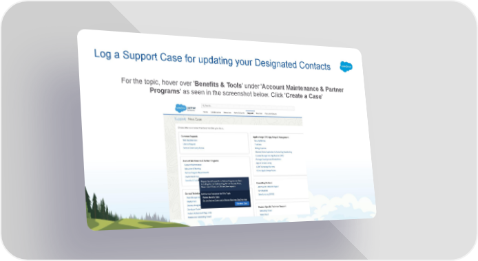 Log a Support Case for updating your Designated Contacts For the topic, hover over 'Benefits & Tools' under 'Account Maintenance & Partner Programs' as seen in the screenshot below. Click 'Create a Case'