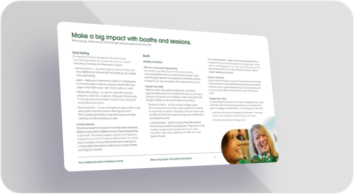 Make a big impact with booths and sessions. Before you go, make sure you think through what your goals are for the event. Goal Setting Booth • Non-booth attendees — these could be your key sales reps for an It’s important to have a clear goal for the event and an BEFORE THE EVENT industry (if the event is industry specific), your sales leader, or your understanding of what success looks like. Success could be partner marketing/partner lead. They can help fill booth spots but many things, but below are a few areas to explore: Plan for a Successful Sponsorship also should be free to join customer/prospect sessions, attend • Brand awareness — you want to get your name out there and Your booth is your official home for the event and is the preset meetings, and network. show Salesforce (or whoever the host is) that you are invested visual representation of your company and your brand. Create Create a Schedule in the partnerships. visuals that grab attention and people who are friendly and able Create a booth schedule so everyone knows where to be and when. • Leads — ideally your investment in a booth or in sending reps to speak to your value proposition. More details below on each. Ensure your team knows to get there early and give yourself plenty to an event results in leads for prospects that fall within your Choose Your Staff of time to check in, get through security, pick up any scanners, and target market (right buyers, right industry, right use cases). Staff your booth with polished, professional, and friendly set up your booth before the event floor is open to the general • Relationship building — you want to meet with important (approachable) people who are passionate about your company, public. prospects, customers, or partners. Having all of these people products, and services and not afraid to make conversation with Prepare Your Team in one place at one time makes it easier to have many quick strangers. Ideally you will have the below in your lineup: You should plan to host one or more prep meetings with your entire conversations face to face. • Someone to demo — an SE or product manager is great event team prior to the event to get everyone up to speed on the • Deal acceleration — do you have significant opportunities in your here. Someone who can show a value-based demo on the fly goals, messaging, and expectations. Consider going over items like: sales pipeline that have contacts attending the event? to any prospect or partner. Depending on the size of the event, • Overview of the event and prospectus information — how many This is a great opportunity to meet with buying committee consider two in this role to allow for breaks and multiple demo people, roles, industries, and personas you can expect. members and demonstrate your value. conversations at once. • 1–2 crowd pullers — just like it sounds, these folks stand at • Preferred hotel and travel arrangements. Content Review the front of your booth and pull people in. They are your most One of your goals for the event is most likely brand awareness. friendly and approachable people who have the value Before you go, ensure collateral and your AppExchange listing proposition nailed down. Marketing and SDRs are usually is up to date. Post-event, prospects, partners, and Salesforce great in this role. employees you connected with are likely to look more closely at your company. Put your best foot forward by taking time a month before the event to make sure your solution sheets and listing are refreshed. How to Make the Most of Salesforce Events Make a big impact with booths and sessions. 2