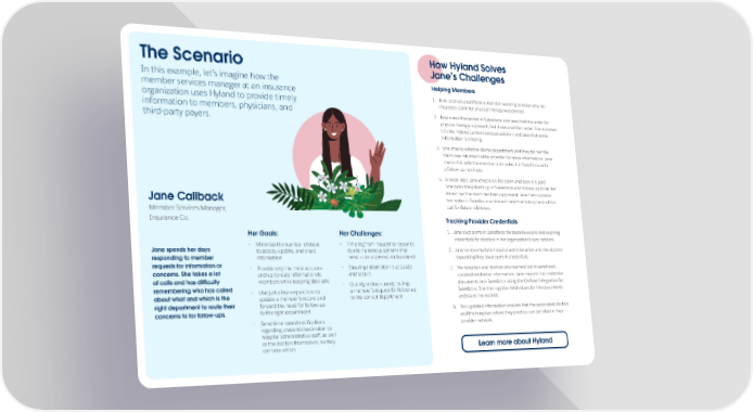 How Hyland Solves The Scenario Jane’s Challenges In this example, let’s imagine how the Helping Members member services manager at an insurance 1. Jane receives a call from a member wanting to know why her organization uses Hyland to provide timely insurance claim for physical therapy was denied. information to members, physicians, and 2. Jane views the record in Salesforce and sees that the order for third-party payers. physical therapy is present, but it was a written order. She accesses it in the Hyland content services solution and sees that some information is missing. 3. She checks with the claims department and they tell her the claim was returned to the provider for more information. Jane shares this with the member and notes it in Salesforce with a follow-up reminder. 4. A week later, Jane checks on the claim and sees it is paid. She looks the patient up in Salesforce and follows up to let her know that the claim has been approved. Jane then updates Jane Callback her notes in Salesforce so she will have the history behind this Member Services Manager, call for future reference. Insurance Co. Tracking Provider Credentials Her Goals: Her Challenges: 1. Jane sees alerts in Salesforce for soon-to-expire and expiring credentials for doctors in her organization’s care network. Jane spends her days • Minimize the number of steps • Time lag from request to response to access, update, and share due to numerous systems that 2. Jane sends emails to hospital administration and the doctors responding to member information need to be accessed and updated requesting they issue current credentials. requests for information or • Provide only the most accurate • Ensuring information is accurate 3. The hospitals and doctors she reached out to send back concerns. She takes a lot and up-to-date information to and secure updated credential information. Jane imports the credential of calls and has difficulty members while keeping data safe • Quickly and accurately routing documents into Salesforce using the OnBase Integration for remembering who has called • Use just a few steps/clicks to a member’s request for follow-up Salesforce. She then applies field values for the documents about what and which is the update a member’s record and to the correct department and saves the records. right department to route their forward the need for follow-up concerns to for follow-ups. to the right department 4. This updated information ensures that the associated doctors • Send time-based notifications and the hospitals where they practice can be listed in their regarding credential expiration to provider network. hospital administrative staff, as well as the doctors themselves, so they can take action Learn more about Hyland