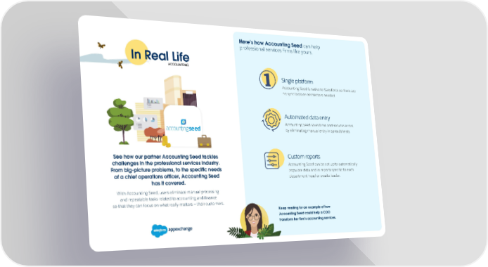 Here’s how Accounting Seed can help professional services firms like yours. In Real Life ACCOUNTING Single Platform Accounting Seed is native to Salesforce so there are no sync tools or connectors needed. Automated Data Entry Accounting Seed saves time and reduces errors by eliminating manual entry in spreadsheets. See how our partner Accounting Seed tackles Custom Reports challenges in the professional services industry. Accounting Seed can be set up to automatically From big-picture problems, to the specific needs populate data and in reports specific to each of a chief operations officer, Accounting Seed department head or c-suite leader. has it covered. With Accounting Seed, users eliminate manual processing and repeatable tasks related to accounting and finance so that they can focus on what really matters — their customers. Keep reading for an example of how Accounting Seed could help a COO transform her firm’s accounting services.