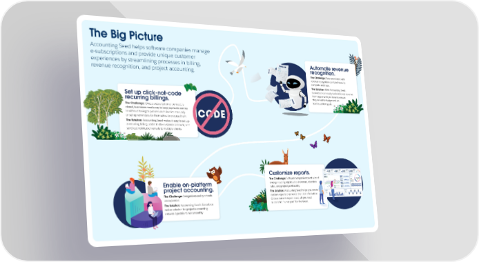The Big Picture Accounting Seed helps software companies manage e-subscriptions and provide unique customer Automate revenue experiences by streamlining processes in billing, recognition. revenue recognition, and project accounting. The Challenge: Tasks associated with revenue recognition can take hours to complete and track. The Solution: With Accounting Seed, businesses can easily track deferred revenue from opportunity to close to ensure Set up click-not-code they are within budget and on recurring billings. track to achieve goals. The Challenge: Once a subscription or contract is closed, businesses need a way to keep payments coming in without having to process each invoice manually or set up reminders for themselves to process them. The Solution: Accounting Seed makes it easy to set up a recurring billing, add it to the customer account, and send out notification emails to multiple clients. Customize reports. The Challenge: Software companies spend a lot of Enable on-platform time generating reports about revenue, retention project accounting. rates, and project profitability. The Solution: Accounting Seed helps you create The Challenge: Integrations and sync tools custom reports that run at the click of a button. are expensive. Once a custom report is set, all you need The Solution: Accounting Seed’s Salesforce to do is hit “run report” for the latest. native solution for project accounting ensures operations run smoothly.
