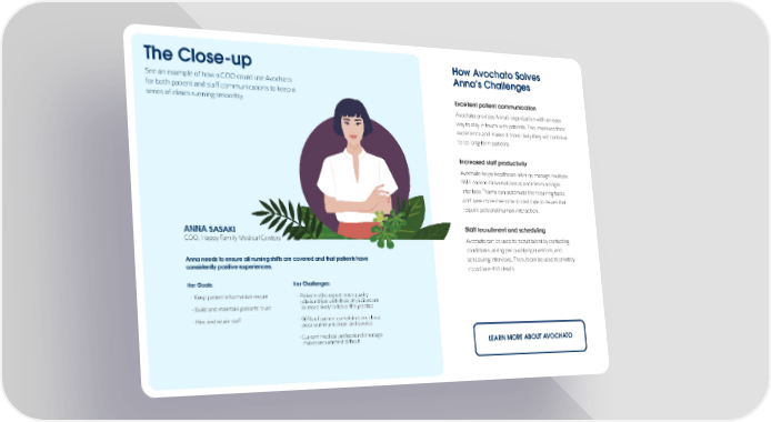 The Close-up How Avochato Solves Anna’s Challenges See an example of how a COO could use Avochato for both patient and staff communications to keep a Excellent patient communication series of clinics running smoothly. Avochato provides Anna’s organization with an easy way to stay in touch with patients. This improves their experience and makes it more likely they will continue to be long-term patients. Increased staff productivity Avochato helps healthcare admins manage multiple SMS patient conversations at once from a single interface. Teams can automate the recurring tasks and have more free time to dedicate to issues that require personal human interaction. ANNA SASAKI Staff recruitment and scheduling COO, Happy Family Medical Centers Avochato can be used to recruit talent by contacting candidates, asking pre-qualifying questions, and Anna needs to ensure all nursing shifts are covered and that patients have scheduling interviews. Then, it can be used to privately consistently positive experiences. coordinate shift details. Her Goals: Her Challenges: - Keep patient information secure - Patients who report poor-quality relationships with their physicians are - Build and maintain patients’ trust 3x more likely to leave the practice - Hire and retain staff - 96% of patient complaints are about poor communication and service - Current medical professional shortage makes recruitment difficult LEARN MORE ABOUT AVOCHATO