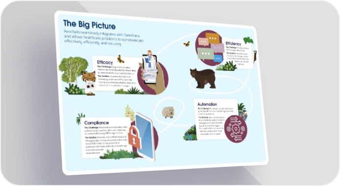 The Big Picture Avochato seamlessly integrates with Salesforce Efficiency and allows healthcare providers to communicate The Challenge: Sending individual effectively, efficiently, and securely. SMS messages doesn’t scale. The Solution: Avochato allows companies to manage multiple conversations at once from one easy-to-use intuitive interface. Efficacy The Challenge: Large communication channels are not always effective. Emails often go unread and phone calls aren’t picked up. The Solution: Avochato facilitates text messaging which has a 98% open rate, making it an extremely effective channel for important, time-sensitive messages. Automation The Challenge: Healthcare providers need to be quick and efficient while maintaining a personal customer experience. The Solution: Avochato enables you Compliance to automatically send personalized messages to multiple recipients The Challenge: Healthcare communications with based on Salesforce triggers. patients contain sensitive information that must Plus, each patient can reply and be protected following HIPAA requirements. seamlessly start a one-on-one The Solution: Avochato is fully HIPAA compliant. conversation with an agent. Messaging data is always encrypted and securely stored. Information is only accessible to authorized individuals, and enterprise audit logs show who accessed what and when.
