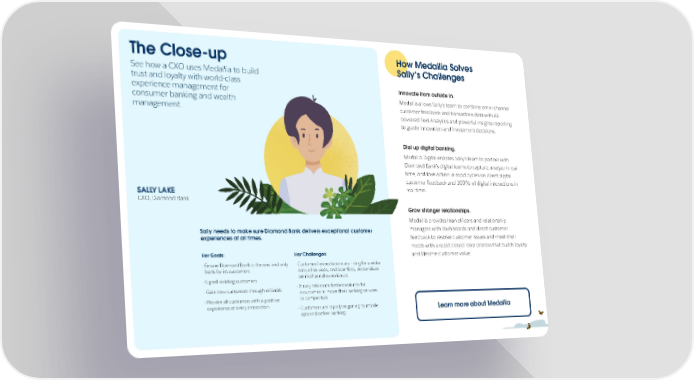 How Medallia Solves The Close-up Sally’s Challenges See how a CXO uses Medallia to build trust and loyalty with world-class Innovate from outside in. experience management for Medallia allows Sally’s team to combine omni-channel consumer banking and wealth customer feedback and transaction data with AI- management. powered Text Analytics and powerful insights reporting to guide innovation and investment decisions. Dial up digital banking. Medallia Digital enables Sally’s team to partner with Diamond Bank’s digital teams to capture, analyze in real time, and take action in rapid cycles on direct digital customer feedback and 100% of digital interactions in SALLY LAKE real time. CXO, Diamond Bank Grow stronger relationships. Medallia provides loan officers and relationship Sally needs to make sure Diamond Bank delivers exceptional customer managers with dashboards and direct customer experiences at all times. feedback to resolve customer issues and meet their needs with a rapid closed loop process that builds loyalty Her Goals: Her Challenges: and lifetime customer value. - Ensure Diamond Bank is the one and only - Customers’ expectations are rising for a wider bank for its customers array of services, and seamless, personalized - Upsell existing customers omni-channel experiences - Gain new customers through referrals - It only takes one bad experience for a customer to move their banking services - Provide all customers with a positive to competitors experience at every interaction - Customers are rapidly migrating to mobile Learn more about Medallia app and online banking.