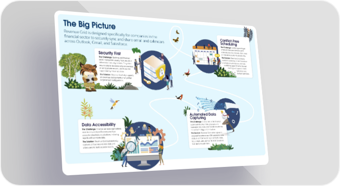 The Big Picture Revenue Grid is designed specifically for companies in the Conflict-Free financial sector to securely sync and share email and calendars Scheduling The Challenge: Conflicting events get across Outlook, Gmail, and Salesforce. scheduled because calendars aren’t automatically cross-checked. Users need an innovative solution to solve for this. The Solution: Revenue Grid checks Security First real-time availability in both Salesforce The Challenge: Banking and financial and Outlook calendars to eliminate sector companies usually have very strict conflicting appointments. Booked information security policies. They often meetings will appear in both require data to be stored only on-premises Salesforce and or using private servers, which are not Outlook calendars. supported by native solutions. The Solution: Revenue Grid fully supports on-premises deployments or any other single tenant configurations. Automated Data Capturing Data Accessibility The Challenge: Companies in the financial sector seek to streamline processes and The Challenge: Financial services organizations customize data capture to Salesforce with the need to ensure that different teams have help of technology and innovation. access to robust data visualizations, including The Solution: Revenue Grid’s data capture is reports with complete data. designed for enterprises. With automatic data The Solution: Revenue Grid automatically capture, companies can sync contacts, tasks, captures all business-related data and files, emails, and calendar items to Salesforce allows users to build accurate reports. from mail and calendars.