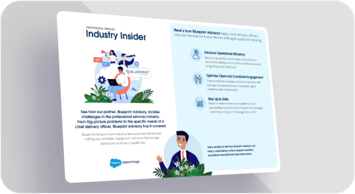 Here’s how Blueprint Advisory helps chief delivery officers PROFESSIONAL SERVICES improve recruitment experiences with agile applicant tracking. Industry Insider Enhance Operational Efficiency Reduce manual effort and increase productivity with streamlined staffing and recruitment workflows powered by Agentforce and Data Cloud. Optimize Client and Candidate Engagement Enhance both the candidate and client experience with seamless recruitment solutions that deliver higher satisfaction and retention rates. Stay Up to Date Adapt to market changes and capitalize on new opportunities for growth and innovation with managed See how our partner, Blueprint Advisory, tackles services that keep your technology stack current. challenges in the professional services industry. From big-picture problems to the specific needs of a chief delivery officer, Blueprint Advisory has it covered. Blueprint Advisory maximizes business outcomes with tailored staffing and candidate engagement solutions that leverage Salesforce’s multicloud capabilities. Keep reading to see how Blueprint Advisory can help a chief delivery officer support seamless recruitment and efficient client interactions.