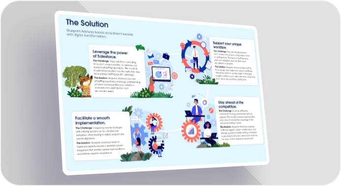 The Solution Blueprint Advisory boosts recruitment success Support your unique with digital transformation. workflow. The Challenge: One-size-fits-all solutions don’t address the unique configuration needs Leverage the power of staffing firms. This leads to inefficiencies, of Salesforce. poor user adoption, and less-than-ideal recruitment outcomes. The Challenge: Many Salesforce consulting The Solution: Blueprint Advisory helps staffing firms don’t understand the complexities and firms design and implement custom workflows. nuances of staffing operations. This results in This allows them to quickly adapt to changing implementations that miss the mark when they market conditions and client demands, improving try to address staffing-specific challenges. both client and candidate satisfaction. The Solution: Blueprint Advisory’s decades of staffing experience and deep understanding of Salesforce ensure that your Salesforce environment is optimized to meet recruitment needs. Stay ahead of the competition. The Challenge: It can be difficult to maintain technology investments without Facilitate a smooth support. This results in missed opportunities implementation. and a loss of competitive advantage in the fast-paced staffing market. The Challenge: Integrating new technologies The Solution: Blueprint Advisory’s ongoing with existing systems can be complex and technical support, system maintenance, and disruptive, often leading to stalled projects and strategic guidance enable staffing companies unmet objectives. to get ahead of industry trends and maximize The Solution: Blueprint Advisory’s team of the value of their Salesforce investment. Salesforce experts ensures a seamless system integration that enables operational excellence and delivers superior experiences.