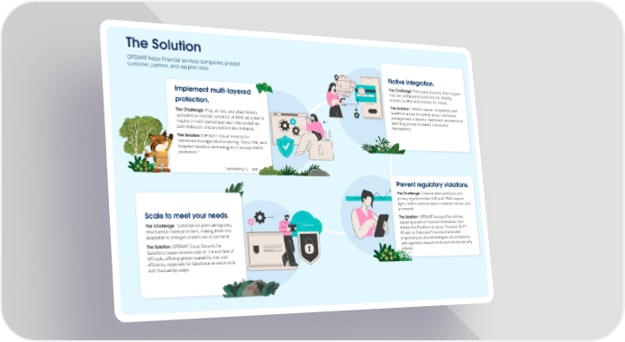 The Solution OPSWAT helps financial services companies protect customer, partner, and supplier data. Native integration. Third-party solutions often require The Challenge: Implement multi-layered intricate configurations and lack the visibility needed to effectively monitor for threats. protection. The Solution: OPWAT’s native compatibility with Salesforce allows for speedy setup. Centralized Files, emails, and attachments The Challenge: management, a dynamic dashboard, and real-time uploaded by internal, external, or third-party teams reporting provide increased control and require a multi-layered approach that combines transparency. both detection and prevention technologies. The Solution: OPSWAT Cloud Security for Salesforce leverages Multiscanning, Deep CDR, and Adaptive Sandbox technologies to provide 100% protection.* * verified by SE Labs Prevent regulatory violations. Financial data protection and The Challenge: privacy regulations like SOX and FINRA require tight control over how data is collected, stored, and Scale to meet your needs. processed. OPSWAT analyzes files without The Solution: Subscription plans are typically exposing sensitive financial information, then The Challenge: structured in fixed-price tiers, making them less deletes the files from its server. Proactive DLPTM adaptable to changes in team size or demand. (Proactive Data Loss Prevention) and other proprietary security technologies aid compliance OPSWAT Cloud Security for The Solution: with regulatory requirements and internal security Salesforce bases solution cost on the number of policies. API calls, offering greater scalability and cost efficiency, especially for Salesforce environments with fluctuating usage.
