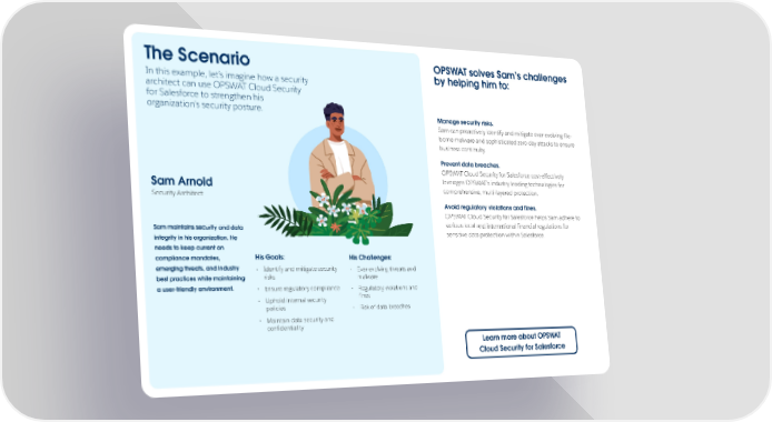 The Scenario OPSWAT solves Sam’s challenges In this example, let’s imagine how a security by helping him to: architect can use OPSWAT Cloud Security for Salesforce to strengthen his organization’s security posture. Manage security risks. Sam can proactively identify and mitigate ever-evolving file- borne malware and sophisticated zero-day attacks to ensure business continuity. Prevent data breaches. OPSWAT Cloud Security for Salesforce cost-effectively Sam Arnold leverages OPSWAT’s industry-leading technologies for comprehensive, multi-layered protection. Security Architect Avoid regulatory violations and fines. OPSWAT Cloud Security for Salesforce helps Sam adhere to Sam maintains security and data various local and international financial regulations for integrity in his organization. He sensitive data protection within Salesforce. needs to keep current on compliance mandates, His Goals: His Challenges: emerging threats, and industry • Identify and mitigate security • Ever-evolving threats and best practices while maintaining risks malware a user-friendly environment. • Ensure regulatory compliance • Regulatory violations and • Uphold internal security fines policies • Risk of data breaches • Maintain data security and confidentiality Learn more about OPSWAT Cloud Security for Salesforce