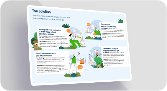 The Solution SharinPix helps you meet all your construction 昀椀eld management needs in Salesforce. Communicate†⠀ performance standards. The Challenge: Contractors need to complete work†⠀ according to your company’s methods and standards, but it can be di昀케cult to communicate all this information.ഀ Manage all your contractor猠⠀ The Solution: SharinPix automatically sends all contractors — even those without†⠀ contextual instructions from Salesforce, delivered as SMS, WhatsApp, or agenda entries, so that everyone is on the Salesforce access. same page. The Challenge: Construction companies often work†⠀ with many external contractors on a job-by-job basis, and†⠀ it can be challenging to track who has accepted each job.ഀ The Solution: SharinPix lets you contact contractors automatically via SMS, WhatsApp, or their digital calendars. When a contractor responds to accept the job, it’s automatically tracked in Salesforce. Automate the execution†⠀ of appropriate follow-ups The Challenge: Making sense of contractor notes and†⠀ Standardize and collect†⠀ 昀椀guring out the necessary follow-up actions post-job is†⠀ a time-consuming process, especially when managing†⠀ job documentation. the projects of multiple contractors.ഀ The Challenge: Construction companies require external contractors to collect speci昀椀c information about the job,†⠀ The Solution: SharinPix helps you learn, via generative†⠀ such as proof that work was completed or an issue was AI-powered summaries, what went on during the job†⠀ recorded correctly.ഀ and if further action needs to be taken. From there, SharinPix automatically assigns follow-up actions†⠀ The Solution: SharinPix sends contractors clickable action to the right stakeholders. items to automatically capture end-of-job information, including photos, signatures, or dynamic surveys. The information is uploaded to Salesforce, even if the contractor is o昀툀ine and isn’t one of your Salesforce users.