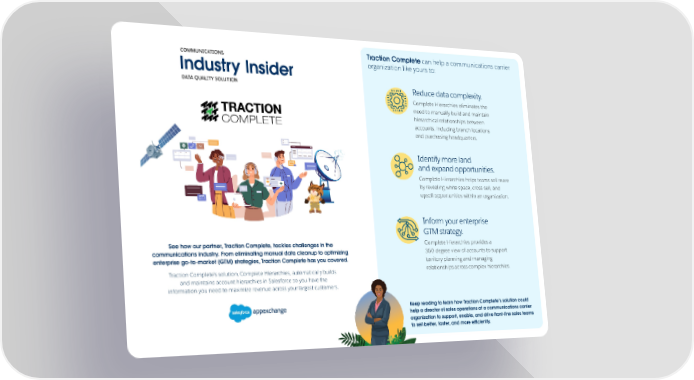Traction Complete can help a communications carrier COMMUNICATIONS organization like yours to: Industry Insider DATA QUALITY SOLUTION Reduce data complexity. Complete Hierarchies eliminates the need to manually build and maintain hierarchical relationships between accounts, including branch locations and purchasing headquarters. Identify more land and expand opportunities. Complete Hierarchies helps teams sell more by revealing white space, cross-sell, and upsell opportunities within an organization. Inform your enterprise GTM strategy. See how our partner, Traction Complete, tackles challenges in the Complete Hierarchies provides a communications industry. From eliminating manual data cleanup to optimizing 360-degree view of accounts to support enterprise go-to-market (GTM) strategies, Traction Complete has you covered. territory planning and managing Traction Complete’s solution, Complete Hierarchies, automatically builds relationships across complex hierarchies. and maintains account hierarchies in Salesforce so you have the information you need to maximize revenue across your largest customers. Keep reading to learn how Traction Complete’s solution could help a director of sales operations at a communications carrier organization to support, enable, and drive front-line sales teams to sell better, faster, and more efficiently.