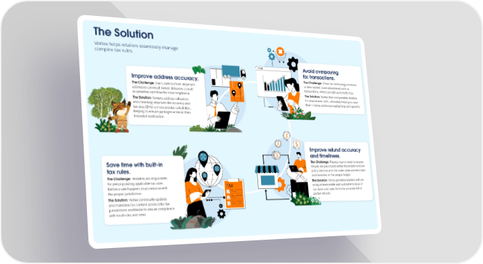 The Solution Vertex helps retailers seamlessly manage complex tax rules. Avoid overpaying for transactions. Improve address accuracy. The Challenge: Other tax technology solutions The Challenge: Inaccurate to/from shipment on the market count abandoned carts as addresses can result in lost deliveries as well transactions, which can add up to hefty fees. The Solution: Vertex does not penalize retailers as penalties and fines for noncompliance. for abandoned carts, ultimately helping to save The Solution: Vertex’s address validation and cleansing improves the accuracy and them money and encouraging long-term growth. tax area ID for a more precise calculation, helping to ensure packages arrive at their intended destination. Improve refund accuracy and timeliness. Save time with built-in The Challenge: Finance teams need to ensure returns are processed within the retailer’s return tax rules. policy window and that sales taxes are refunded The Challenge: Retailers are responsible and recorded in the proper ledger. for pre-populating applicable tax rates The Solution: Vertex provides retailers with an before a sale happens in accordance with easily referenceable and auditable lookup of tax dates and rates for more accurate full or the proper jurisdiction. The Solution: Vertex continually updates partial refunds. and maintains tax content across sales tax jurisdictions worldwide to ensure compliance with local rules and rates.