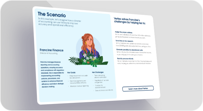The Scenario Vertex solves Francine’s In this example, let’s imagine how a director challenges by helping her to: of accounting can use Vertex to improve accuracy and operational efficiency. Assign the proper address. Vertex uses a database of more than 163 million addresses, giving you the power to choose the one you want. Save time on tax research. Vertex maintains and updates tax content across more than 20,000 global sales tax jurisdictions, saving you time. Francine Finance Eliminate penalties for abandoned carts. Vertex only counts completed sales in transaction volume, Director of Accounting so you only pay for the sales you complete. Quickly process refunds. Francine manages financial Vertex maintains more than 1 million historical dates and reporting and accounting rates, helping you adhere to unlimited refund timelines. operations, ensuring accuracy and compliance with regulatory standards. She is responsible for Her Goals: Her Challenges: implementing accounting • Help ensure more accurate • Time-consuming policies, procedures, and tax calculations address verification systems to enhance financial • Optimize payments and • Magnitude of tax rules efficiency and inform strategic document flow of funds and policies decision-making. • Maintain revenue reporting • Penalties for abandoned carts • Slow and inaccurate refunds Learn more about Vertex