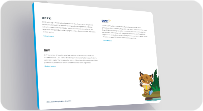 OCTO IoT4I app is the disruptive digital solution that allows insurers to figure out SmartCOMM™ for Salesforce is the industry-leading enterprise document individual customer driving behavior favoring customer engagement and cross- generation platform specifically designed to meet today’s complex customer needs. selling. Insurance marketing and sales teams can build campaigns selecting the SmartCOMM helps enterprises deliver personalised, interactive communications target from their portfolio in order to propose a motor line personalised offer based via customers’ preferred channels. Designed for the business user, SmartCOMM on Octo scoring. simplifies and standardises communications processes leading to improved internal efficiency, increased ROI and improved customer experience. Find out more > Find out more > Shift Technology delivers AI-native SaaS solutions to 90+ Insurance clients and has analysed over 1.5Bn claims. Shift Intelligent Insurance Platform is an AI claims automation engine that increases the volume of touchless claims, empowers claims professionals, and enables carriers to deliver the best claims experience. Find out more > EMEA ISV Industry Booklet – Insurance