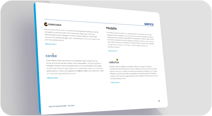 Service Every company runs projects, for research and development marketing, customer The Medallia Experience Cloud is a customer experience platform, which brings onboarding, customer success, IT and much more. Cloud Coach is the only together the best capabilities for collecting voice-of-customer feedback and signals, enterprise class project management solution built on Salesforce. Cloud Coach analysing the results and bringing insights to employees for customer-centric action. supports both waterfall and agile project methodologies so there is no business we With the Medallia Sales & Service Experience integration application, this outside-in can’t help provide value to! view of the customer can be unified with Salesforce data to ensure that employees are aligned with customers, drive higher customer loyalty, and improve Find out more > business outcomes. Find out more > Coveo enables enterprises to thrive in the experience age, through delivering unique experiences that are relevant, unified, and valuable. The Coveo Experience Intelligence Platform uses AI, intelligent search and recommendation technologies Natterbox delivers global cloud telephony, 100% embedded in Salesforce. to personalise millions of digital experiences. Coveo delivers solutions for commerce Natterbox empowers businesses to use live CRM data to deliver personalised phone and service built on the coveo experience intelligence platform for enterprises in high journeys, with high call quality, around the globe. Natterbox enables you to increase tech, manufacturing and financial services. efficiency, improve productivity and enhance the customer experience. Natterbox Find out more > Freedom offers a transformative interface with the ability to work wherever you want, from any device you want. Find out more > EMEA ISV Industry Booklet – Insurance 1010