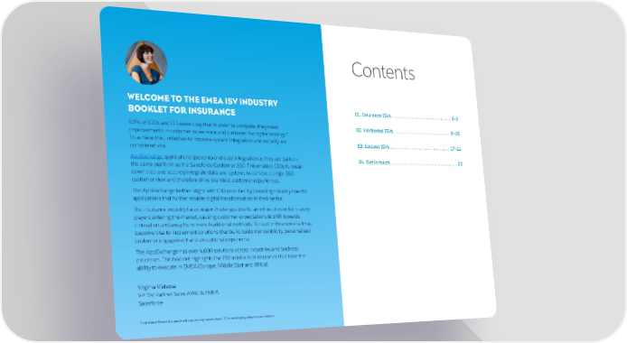 Contents WELCOME TO THE EMEA ISV INDUSTRY BOOKLET FOR INSURANCE 01. Insurance ISVs . . . . . . . . . . . . . . . . . . . . . . . . . . . . . 3–5 93% of CIOs and IT Leaders say that in order to compete, they need 02. Horizontal ISVs . . . . . . . . . . . . . . . . . . . . . . . . . . . 6–16 improvements in customer experience and customer facing technology.* To achieve this, initiatives to improve system integration and security are 03. Success ISVs . . . . . . . . . . . . . . . . . . . . . . . . . . . . . 17–21 considered vital. AppExchange applications speed up and ease integration as they are built on 04. Get in touch . . . . . . . . . . . . . . . . . . . . . . . . . . . . . . . . 22 the same platform as the Salesforce Customer 360. This enables CIOs to break down silos and securely integrate data and systems to achieve a single 360 customer view and therefore drive seamless customer experiences. The AppExchange further aligns with CIO priorities by providing industry-specific applications that further enable digital transformation in their sector. The insurance industry faces major challenges due to an influx of new, tech-savvy players entering the market, causing customer expectations to shift towards innovation and away from more traditional methods. To lead in this new era it has become vital to implement solutions that build customer-centricity, personalised customer engagement and exceptional experience. The AppExchange has over 4,600 solutions across industries and business processes. This booklet highlights the ISV solutions in insurance that have the ability to execute in EMEA (Europe, Middle East and Africa). Virginia Matassa VP ISV Partner Sales APAC & EMEA Salesforce *Salesforce Research analysed survey responses from 100+ technology leaders worldwide