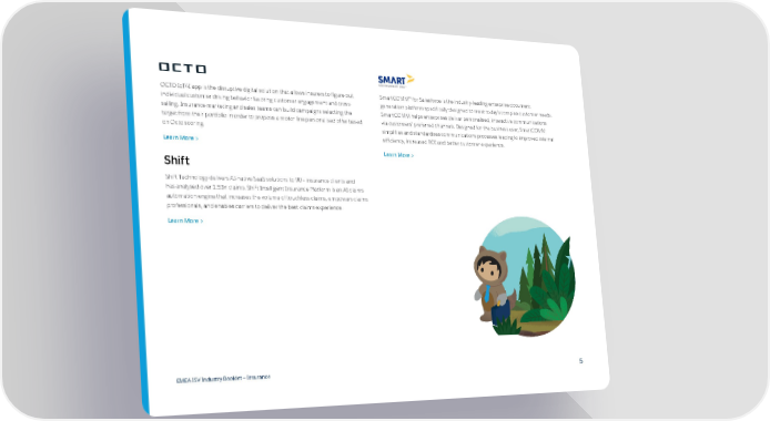 OCTO IoT4I app is the disruptive digital solution that allows insurers to figure out SmartCOMM™ for Salesforce is the industry-leading enterprise document individual customer driving behavior favoring customer engagement and cross- generation platform specifically designed to meet today’s complex customer needs. selling. Insurance marketing and sales teams can build campaigns selecting the SmartCOMM helps enterprises deliver personalised, interactive communications target from their portfolio in order to propose a motor line personalised offer based via customers’ preferred channels. Designed for the business user, SmartCOMM on Octo scoring. simplifies and standardises communications processes leading to improved internal efficiency, increased ROI and better customer experience. Learn More > Learn More > Shift Technology delivers AI-native SaaS solutions to 90+ insurance clients and has analysed over 1.5Bn claims. Shift Intelligent Insurance Platform is an AI claims automation engine that increases the volume of touchless claims, empowers claims professionals, and enables carriers to deliver the best claims experience. Learn More > EMEA ISV Industry Booklet — Insurance 5
