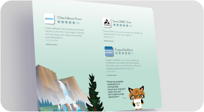 CData Software Drivers Simba ODBC Driver 5.0 5.0 “ CData Software Drivers enable us to access “ Simba ODBC Driver works as advertised. Really easy Salesforce and other cloud apps, to interact implementation, and super support.” with their data, from various on-premise NICK VAN BEEST apps and systems.” Find out more > DOUG NEWTON Find out more > PROGRESS Progress DataDirect DATADIRECT 5.0 “ Progress DataDirect is a simple, reliable way to integrate summarized data from external information systems into Salesforce. The best software investment in a long time.” CHRIS FRENCH Find out more > “Ther e are analytics implications in moving data. House your analytics under one roof with AppExchange dataloaders.” APPY TIP