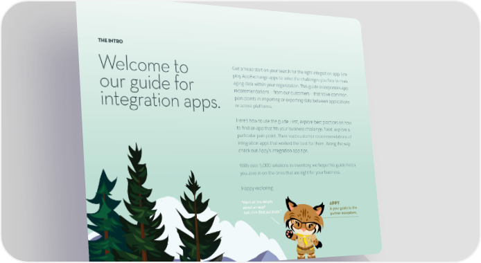 THE INTRO Welcome to Get a head start on your search for the right integration app. Em- ploy AppExchange apps to solve the challenges you face in man- our guide for aging data within your organization. This guide incorporates app recommendations — from our customers — that solve common pain points in importing or exporting data between applications integration apps. or across platforms. Here’s how to use the guide: First, explore best practices on how to find an app that fits your business challenge. Next, explore a particular pain point. Then read customer recommendations of integration apps that worked the best for them. Along the way, check out Appy’s integration app tips. With over 5,000 solutions in inventory, we hope this guide helps you zero in on the ones that are right for your business. Happy exploring. “ Want all the details about an app? Appy Just click Find out more.” is your guide to the partner ecosystem.