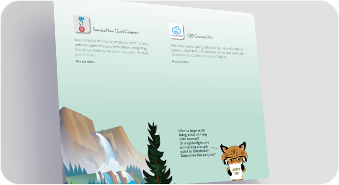 ServiceNow QuickConnect QB Connect Pro Experience bi-directional integration functionality The fastest way to sync QuickBooks Online and Salesforce, between Salesforce and ServiceNow, integrating supports all aspects of QuickBooks Online, and works with Salesforce sObjects like Cases, Accounts, Contact, Opportunities, Quotes, or Custom Objects. and Contract. Find out more > Find out more > “W ant a large-scale integration of many data sources? Or a lightweight one connecting a single point to Salesforce? Determine this early on.” APPY TIP