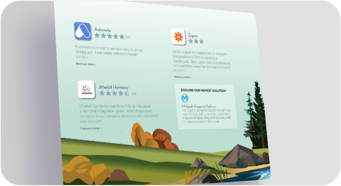 Automate Zapier 5.0 “ Automate is simple to use and easy to set up. “ Zapier is great for integrations. It connects Simply put, it just works without a hassle.” our proprietary CRM to Salesforce, ASHOK G. Quickbooks, Slack, and more. Our processes Find out more > and workflows would be doomed without it.” LISA KEOGH Find out more > Jitterbit Harmony EXPLORE OUR NEWEST SOLUTION 4.5 “ Jitterbit Harmony’s real-time APIs let me create Mulesoft Anypoint Platform a real-time integration system which impressed You’ll get a complete solution for API-led everyone in our company who’s seen it in operation.” connectivity, with a seamless application network of apps, data, and devices, both MARK DOGGETT on-premises and in the cloud. Find out more >