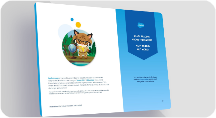 Enjoy reading about these apps? Want to find out more? AppExchange is the most trusted enterprise cloud marketplace with over 4,900 For more information on AppExchange ready- to-install solutions and a range of Nonprofit and Education International solutions, drop us a line or get in touch Consultants to help you extend Salesforce into any department. With more than 9M+ with your Account Executive. installs and 117thousand customer reviews, the AppExchange apps help you solve critical challenges and save time! The apps featured in these booklets have been selected based on their strong use cases in the nonprofit/ education industries, and an ANZ/EMEA presence with in-region support for our customers. International ISV Industry booklet - EMEA & ANZ 27