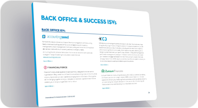 BACK OFFICE & SUCCESS ISVs BACK OFFICE ISVs Reinvent the way you do accounting and financial management with Accounting XCD allows you to manage the entire employee or volunteer lifecycle at every stage. Seed, a native accounting and ERP solution on Salesforce with inventory Using the only single HR and UK Payroll solution on the Salesforce platform, you will management, project management, fund accounting, and more! Accounting Seed benefit from all of your data in one place, reducing administration and complexity also serves clients with multi-currency and multi-company needs. whilst improving ROI and functionality. XCD is highly configurable, allowing you to Accounting Seed is a horizontal solution that serves all industries with particular design a system that meets your specific requirements. Having talent management, strength in nonprofit and higher education. Learn more at performance management, and payroll information at the click of a button means www.accountingseed.com. you’ll be able to engage candidates from their first touch-point, reward them well, and pay them on time. XCD’s easy to use and intuitive HR service platform allows you Learn More > to provide a responsive and personalised experience, at scale. Learn More > FinancialForce business applications are specifically designed for service centric organisations. They combine with Salesforce to deliver a single solution for the whole opportunity-to-cash process, seamlessly bringing the front and back office together Zumzum Financials is Accounting Software, built for NGOs to combine fundraising as one. Bringing together all of your data about customers, operations and finance and finance processes in a single solution, 100% native on Salesforce. Increase enables you to see your organisation in full colour. operational efficiency by simplifying finance processes, avoiding duplicate data entry and automating the complete donation-to-cash process. Blend fundraising and Learn More > finance data to view real-time analytics to make better decisions. Learn More > International ISV Industry booklet - EMEA & ANZ 24