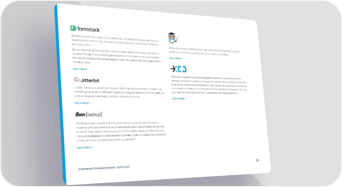Hands-free workflows, easily route submissions, feedback, and approvals between departments for admissions, financial aid, and more with our education workflow automation tools. With out of the box connectivity to finance and LMS, RIO Education supports application, enrollment, grading, attendance and student billing. Secure data sharing that improves communication and controls how information is shared through intuitive routing and logic tools. Formstack Forms also complies Learn More > with Section 508 and WCAG standards to meet the needs of all users, regardless of disability status. Learn More > XCD is a comprehensive people management platform, secure and efficient, allowing institutions to carefully manage their people data, compliance, employee experience, development and retention. XCD’s smart recruitment and onboarding Jitterbit Harmony is a leading Enterprise iPaaS that helps accelerate innovation by automation eliminate much of the administrative burden associated with building combining the power of APIs and integration. Integrate Salesforce with any SaaS, on- your team and ensures a consistent, measurable candidate experience. prem or cloud app, and easily compose innovative solutions. Learn More > Learn More > OwnBackup helps educational institutions prevent data loss and corruption incidents with comprehensive, automated backups and rapid, stress-free recovery. As the #1 SaaS data protection platform on the AppExchange, OwnBackup helps institutions safeguard critical data and more easily meet compliance requirements, so they can focus on their students, faculty, and staff. Learn More > International ISV Industry booklet - EMEA & ANZ 22