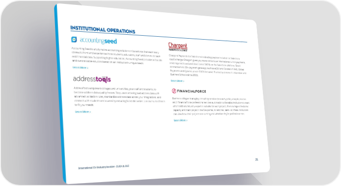 Institutional Operations Accounting Seed is a fully native accounting solution on Salesforce that seamlessly connects front end experiences from students, educators, staff and donors to back Chargent Payments for Salesforce is a leading payment solution on Salesforce end financial data. Supporting higher education, Accounting Seed provides a flexible AppExchange. Chargent gives you more control over international tuition payments, and customizable solution based on an institution’s unique needs. enabling credit card and direct debit 100% on the Salesforce platform. Direct connections to 30+ payment gateways, such as eWAY and Ezidebit in ANZ, Global Learn More > Payments and Cybersource in EMEA included. Trusted by dozens of Universities and Business Schools since 2008. Learn More > AddressTools empowers colleges and universities, your staff and students, to become address data quality heroes. Stop users entering bad address data with advanced validation rules, standardize address data across your integrations, and Business colleges managing consulting services (research, policy analysis, studies connect with students and alumni by reducing failed deliveries. Use our suite of tools etc.). FinancialForce professional services automation will enable institutions to track to fit your needs. which skill set/industry expert is suitable for each project, then manage schedules/ Learn More > capacity and track project time & expense, milestones, tasks - so these institutions can view how their projects are running and whether they’re profitable or not. Learn More > International ISV Industry booklet - EMEA & ANZ 21
